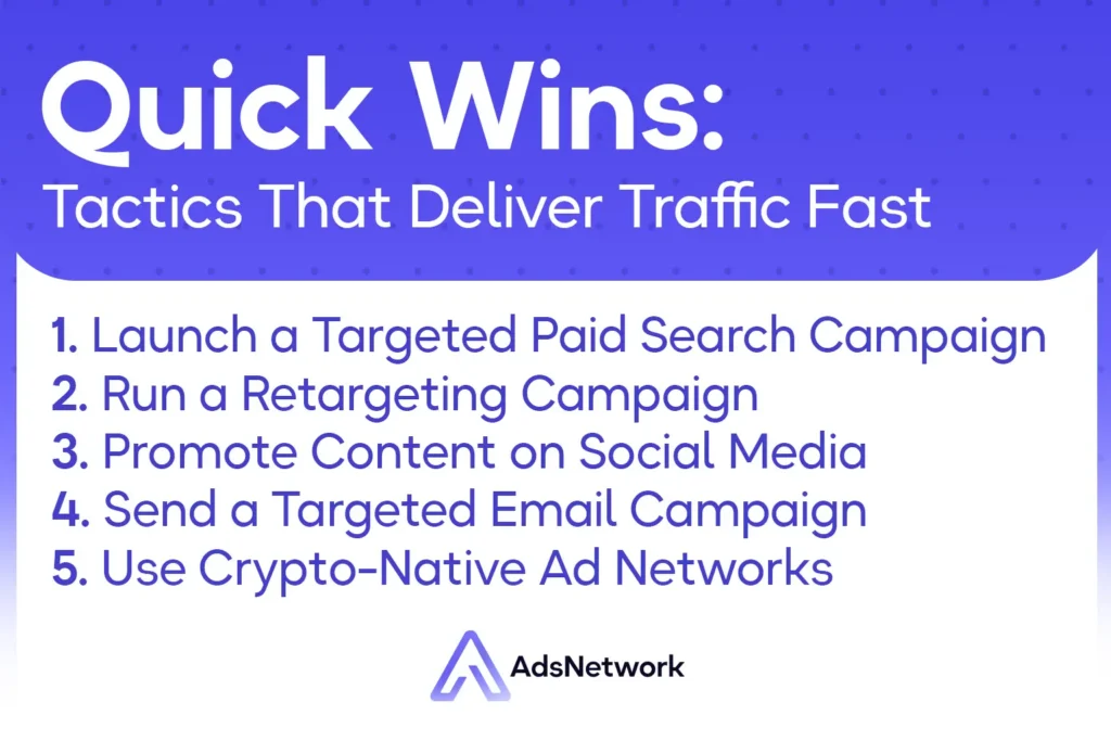 Paid search and social media campaigns deliver the fastest results, typically within hours of going live. Targeted email campaigns can generate significant traffic within minutes of sending. Retargeting campaigns are also fast because they reach users who already know your brand. For Web3 projects, specialist crypto ad networks provide fast paid traffic without the policy restrictions that block mainstream platforms. However, fast tactics generate traffic only while active. Long-term strategies like SEO and email list building start slow but compound into durable traffic that continues without ongoing spend.