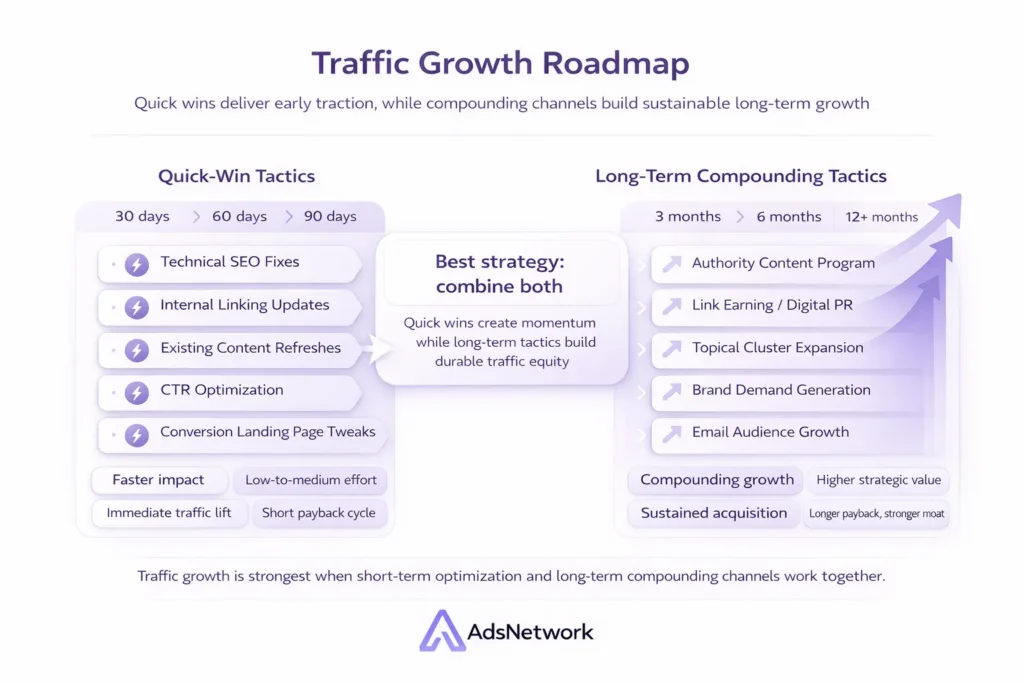 Traffic growth rarely happens by accident. If you want to grow website traffic, it happens when you match the right tactic to the right stage and execute consistently. Some tactics deliver results in days. Others take months to compound. The most effective strategies combine both: quick wins for immediate visits and long-term investments that keep paying.