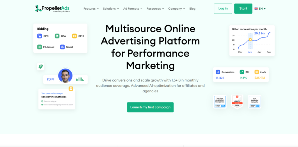 PropellerAds covers 195 geographic regions with over 12 billion daily advertising impressions, making it one of the largest multisource networks on the market. Per BusinessOfApps’ CPM network directory, it consistently appears among the most accessible options for publishers with no minimum traffic requirement, including newer and growing sites.