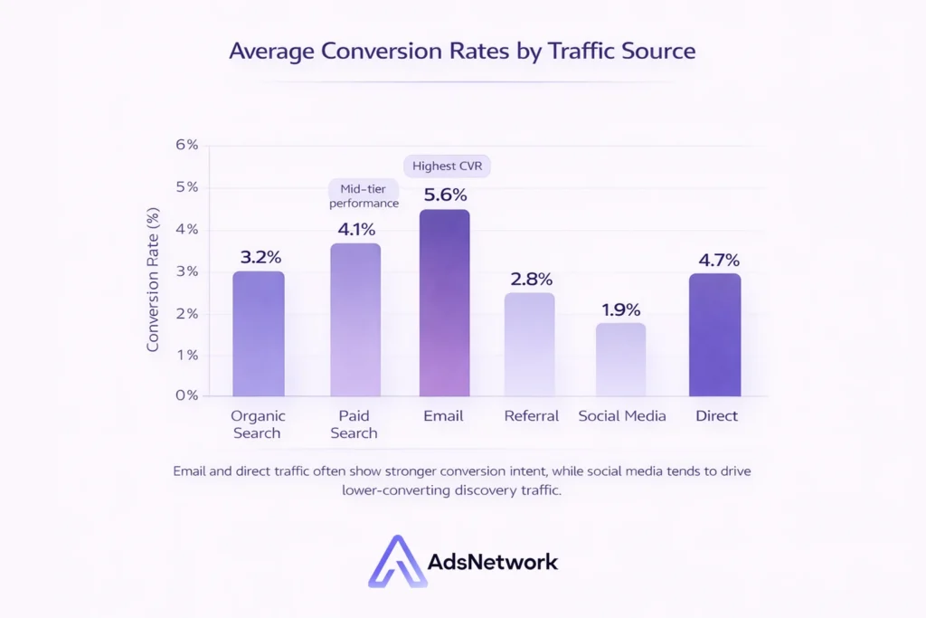 Direct traffic has the highest intent of any source. Users who navigate directly to your site already know your brand and have a reason to visit. Conversion rates for direct traffic average around 3.3%, above any paid channel benchmark.