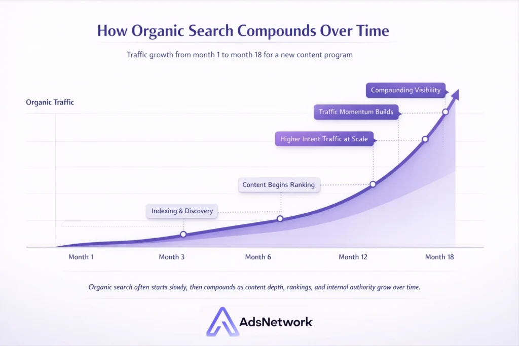 The appeal of organic search is compounding returns. A well-ranked piece of content brings traffic month after month without additional spend. The cost per visit drops over time as the content accumulates authority. That dynamic makes it one of the best long-term investments for any online business.