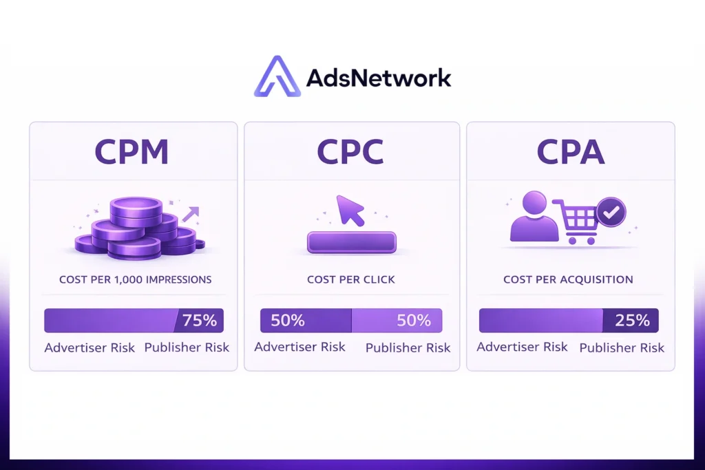 These three models describe how advertisers pay for digital ad inventory. They differ in what triggers a payment and who carries the risk when an ad does not perform.