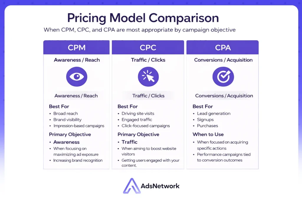 Ad networks use several different pricing models, and the right one depends on your campaign objective. The main options are CPM (cost per thousand impressions), CPC (cost per click), CPA (cost per action), and revenue share for publishers.