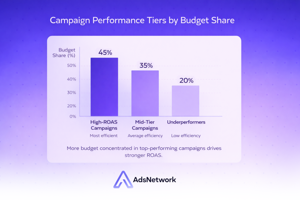 A practical budget allocation framework splits spend across three tiers based on performance data. Top-performing campaigns, those with CPA or ROAS comfortably inside your target range, receive the largest share and are scaled first. Middle-tier campaigns get steady budget to gather more conversion data before decisions are made. Bottom-tier campaigns, those consistently outside target metrics, get budget reduced or paused while you diagnose the issue.