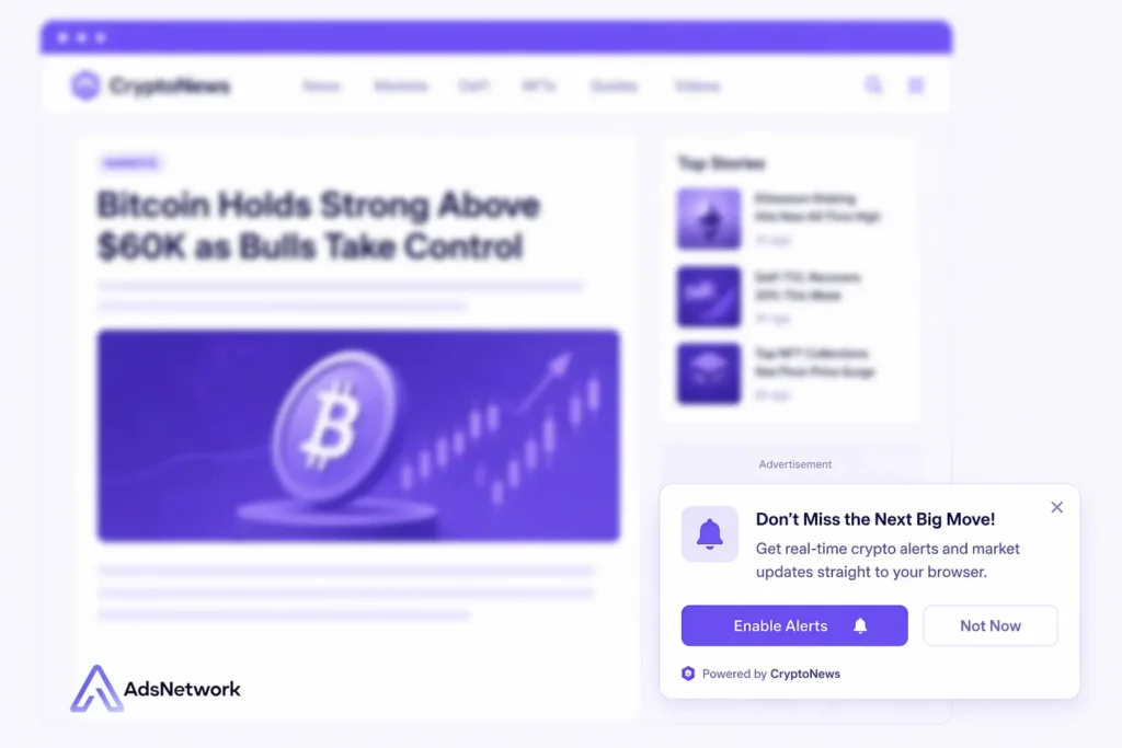 Crypto projects need ad formats that reach engaged audiences without relying on platforms that restrict blockchain advertising. In-page push ads fit this requirement perfectly. The format operates through ad networks that welcome crypto advertisers, bypassing the policy barriers imposed by Google and Meta.