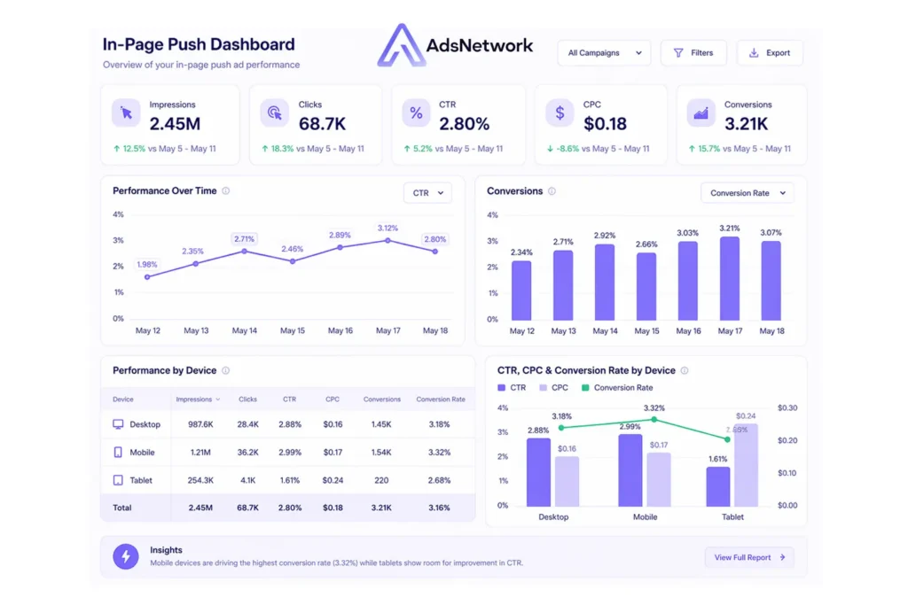 Moreover, the format works on all devices and operating systems. Traditional push notifications cannot reach iOS users because Apple restricts browser-level notification subscriptions. In-page push ads solve this limitation completely, opening up the entire Apple audience to advertisers. According to Adsterra, this cross-device compatibility is the format’s single biggest advantage over classic push.