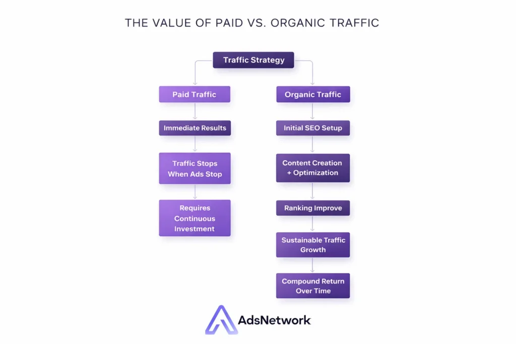 Organic traffic comes from unpaid sources: search engine rankings, social media posts, referral links, and direct navigation. You earn it through content quality, technical SEO, and accumulated authority. It takes time to build but delivers returns that continue long after the initial investment.